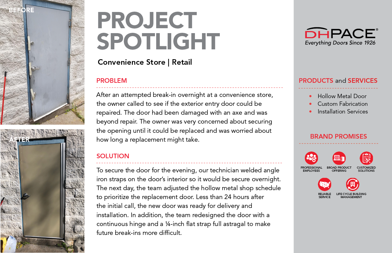 After an attempted break-in overnight at a convenience store, the owner called to see if the exterior entry door could be repaired. The door had been damaged with an axe and was beyond repair. The owner was very concerned about securing the opening until it could be replaced and was worried about how long a replacement might take.