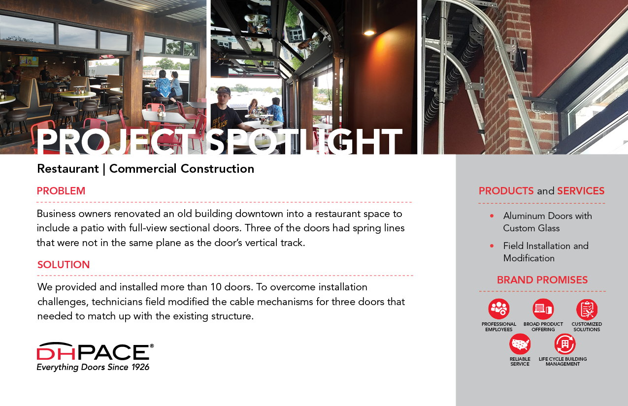 Business owners renovated an old building downtown into a restaurant space to include a patio with full-view sectional doors. Three of the doors had spring lines that were not in the same plane as the door’s vertical track.